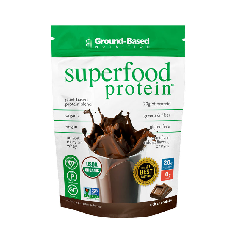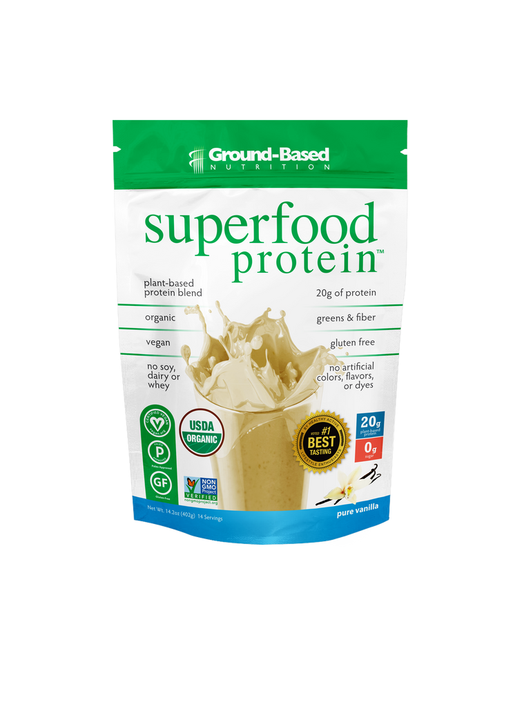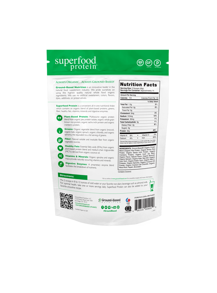 Superfood es un suplemento de proteina vegetal todo en uno que contiene una mezcla orgánica de proteínas vegetales, verduras, fibra, grasas saludables, vitaminas, minerales y enzimas digestivas.