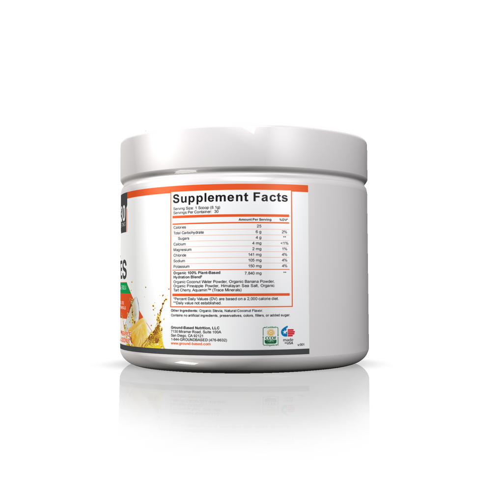 Ingredientes orgánicos de electrolito: Polvo de agua de coco orgánico, polvo de plátano orgánico, polvo de piña orgánica, sal marina del Himalaya, cereza agria orgánica, Aquamin ™ (minerales de origen vegetal traza), estevia orgánica, sabor de coco natural.