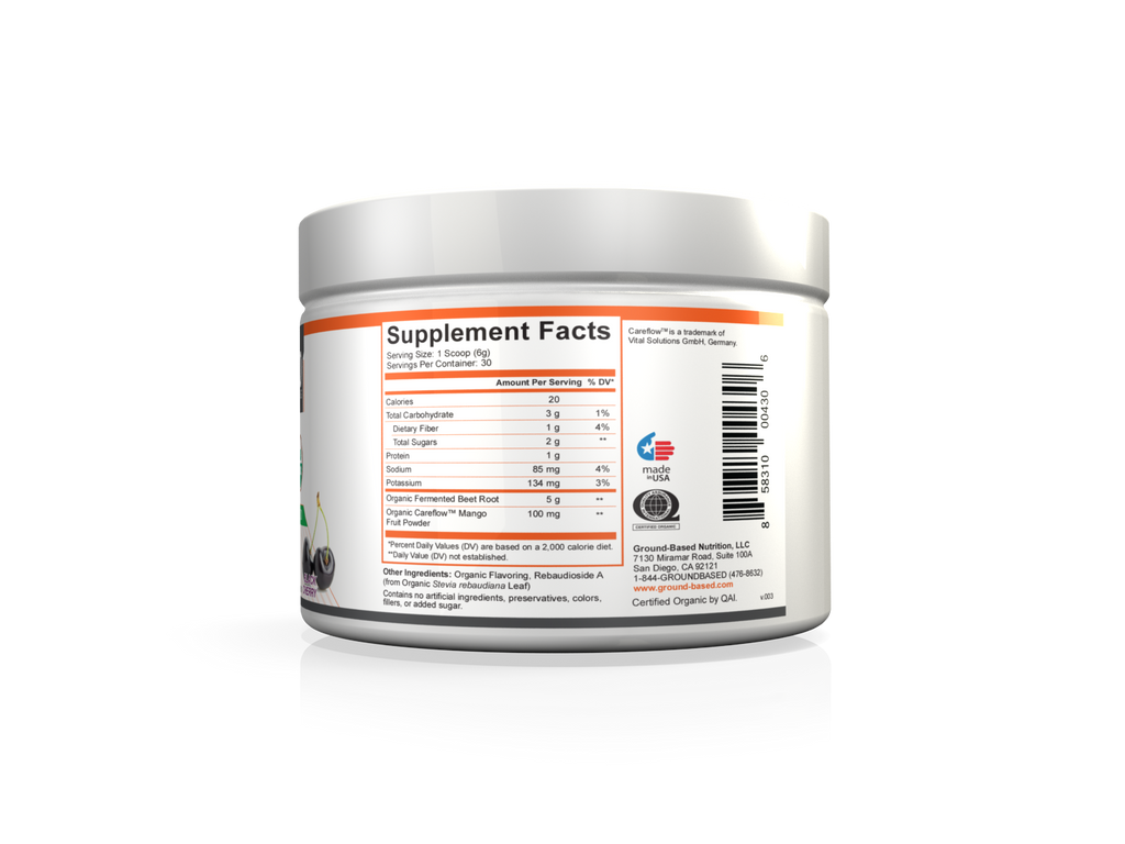 Ingredientes orgánicos de la remolacha: raíz de remolacha fermentada orgánica, polvo de fruta de mango orgánico de Careflow ™, aromatizante orgánico, rebaudiósido A (de hoja de Stevia rebaudiana orgánica).